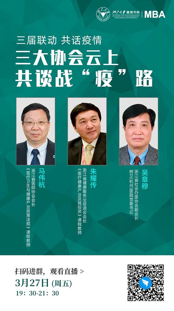 为替大家答疑解惑、贡献医疗健康管理智慧,浙江大学管理学院邀请3位浙江省医疗健康行业的“关键人物”,于3月27日晚相聚钉钉直播间,共话战“疫”得与失。