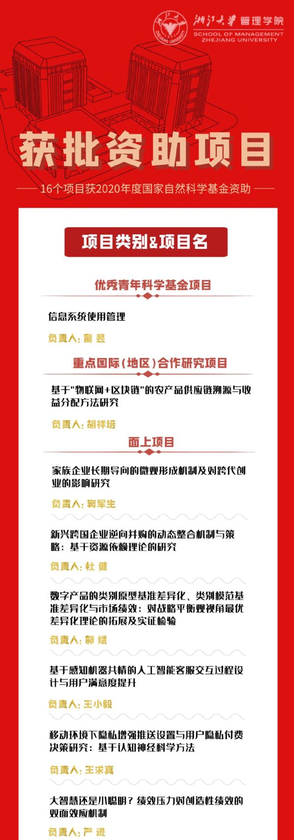 9月18日,2020年度国家自然科学基金申请项目评审结果公布。浙江大学管理学院共有16个项目获得国家自然科学基金资助。其中,优秀青年科学基金项目1项,重点国际(地区)合作研究项目1项,面上项目6项,青年科学基金项目7项,专项项目1项。