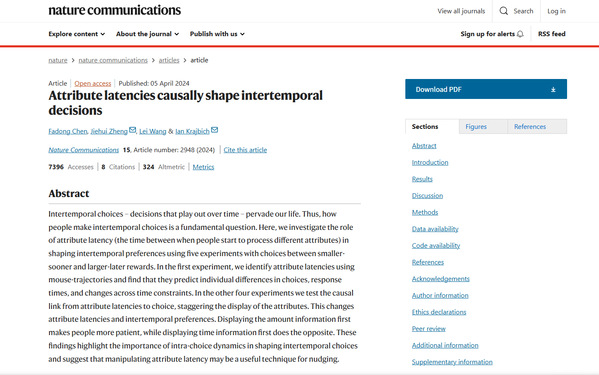 学术影响方面,成果在国际顶级期刊发表后,被Nature Reviews Psychology,Science Advances,Nature Communications,Organizational Behavior and Human Decision Process等引用,并被包括美国人文与社会科学院院士、加州理工学院Colin Camerer教授在内的国际权威学者在专著与后续研究中多次引用、讨论20余次;实验范式与分析方法被多位学者采纳,用于跨期决策、注意力分配及多属性选择等研究,推动了行为决策与认知科学的深度融合。