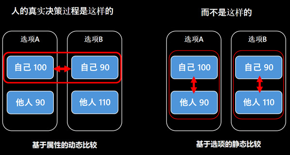 这就表明:其一,人们的决策是基于属性的动态比较加工过程,即先在一个属性上对不同选项进行比较,然后再在另一个属性上对不同选项进行比较,最后做出选择,而非基于选项的静态比较,在选项内部,通过整合不同属性,计算每个选项的效用,选择效用大的那个选项。
