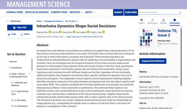 *项目的两项核心成果分别发表于国际高水平期刊《Nature Communications》和《Management Science》上,合作者分别为浙江大学管理学院教授汪蕾、博士生朱芝,上海外国语大学教授沈强,杭州师范大学副教授郑杰慧,加州大学洛杉矶分校教授Ian Krajbich,苏黎世大学教授Todd Hare。