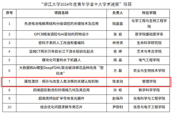 作为浙大社科领域首个获此殊荣的项目,该研究不仅揭示了人类决策背后的关键认知机制,解释了个体偏好差异,还发现了一个能够被干预的重要认知成分——“属性潜伏”。