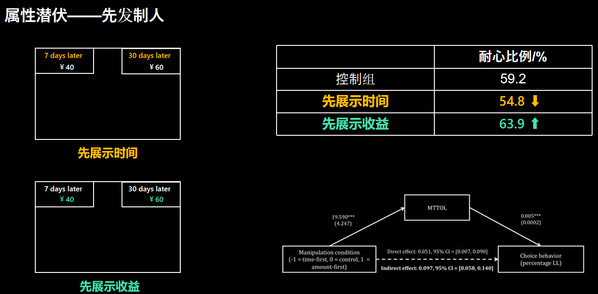 结果实验表明,改变属性信息呈现的顺序,真的能改变选择。“我们发现,先展示时间,人们的大脑会先加工时间,这让人变得更加冲动;先展示收益,人们的大脑会先加工收益,这让人变得更有耐心。”