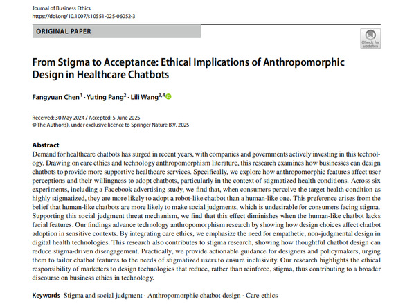 研究团队从关怀伦理与技术拟人化学术视角出发,通过五项在线实验和一项Facebook实地研究,系统解答了这一关键问题。这项发表于国际高水平期刊Journal of Business Ethics(FT50期刊之一)上的研究显示,在涉及隐私和污名的场景里,过于拟人化的设计可能反而让用户更有压力,从而减少使用意愿。该成果不仅揭示了医疗聊天机器人设计的“情境适配密码”,更为数字健康技术的伦理化、包容性发展提供了兼具理论深度与实践价值的全新思路。