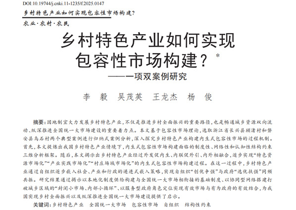 这项研究提炼出了内生式包容性市场构建的过程机制,拓展了乡村特色产业市场机制的理论边界,识别出了乡村自组织的递进式嵌入策略,为内生式包容性市场构建提供了中国经验。