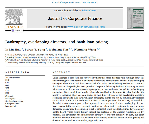 曾经有一篇论文,让我觉得比较“遗憾”。这篇论文研究的是董事的声誉问题。当时,很多文献关注的都是董事的特征,但很少有人去关注“声誉”这个难以量化的变量,我们想了个很巧妙的办法来解决这个难题。具体而言,我们的研究回答了这样一个问题:当一家公司破产时,与该公司有共同董事的其他企业,是否会在银行借贷中面临更苛刻的贷款条件(如更高利率)?