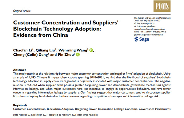 还有一点特别重要,那就是对现实问题的关注,将现实的案例和文献做结合,就会产生新的思路。例如我今年上线Production and Operations Management的一篇文章,就是关注到了近年来热度很高的“区块链技术”,我们发现虽然大家对这个技术都很认可,实际应用到企业中的却很少,所以就想知道为什么会出现这种“叫好不叫座”的情况。这篇文章因为选题很新,现有的数据又很少,也是经过了比较漫长的审稿流程,这也是我们科研工作的常态。