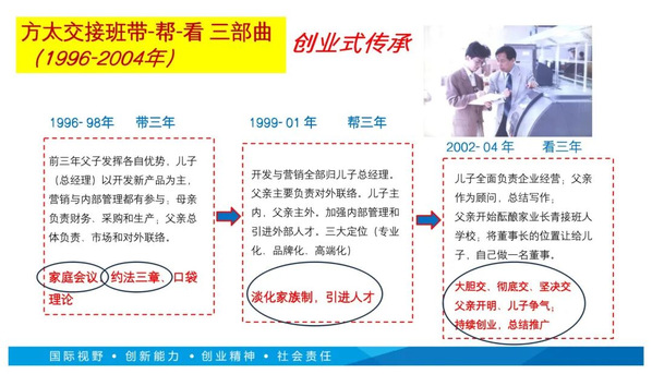 儿子全面负责,父亲退居二线,著书立说,并最终将董事长之位交予儿子。