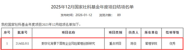 日前,全国哲学社会科学工作办公室正式公布了2025年12月国家社会科学基金年度项目结项结果。浙江大学此次共有五个项目成功结项,其中,由浙江大学管理学院财务与会计学系陈俊教授主持完成的国家社会科学基金重点项目“数字化背景下国有企业风险管理创新研究”获评“优秀”,成为浙大此次唯一获评“优秀”的项目。